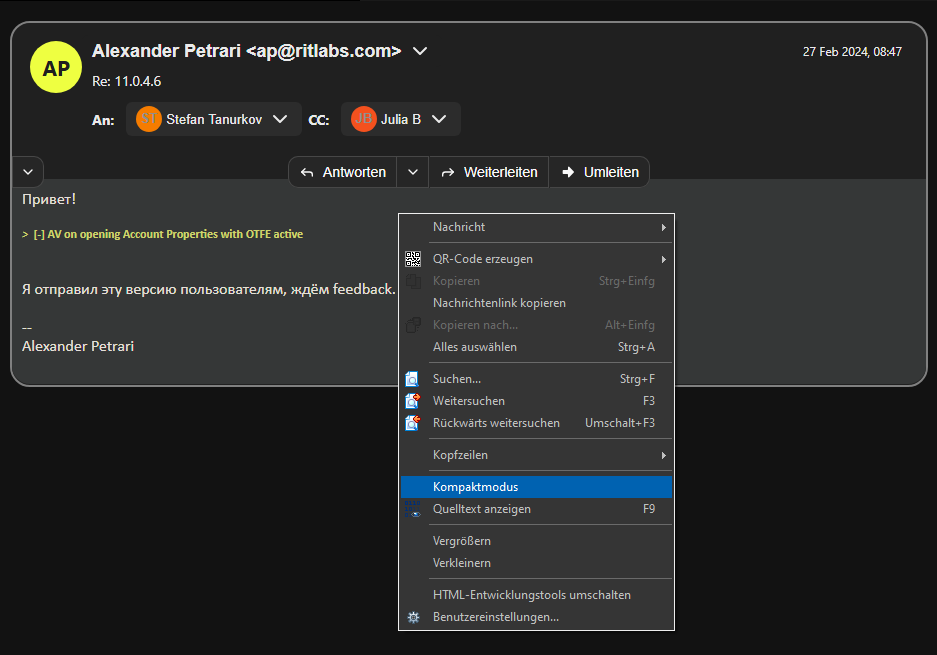 Der Kompaktmodus ist besonders nützlich bei der Analyse des bisherigen Schriftverkehrs, bei umfangreichen Diskussionen mit vielen Antworten sowie in Situationen, in denen der gesamte Verlauf schnell überblickt werden soll, ohne ständig scrollen zu müssen.